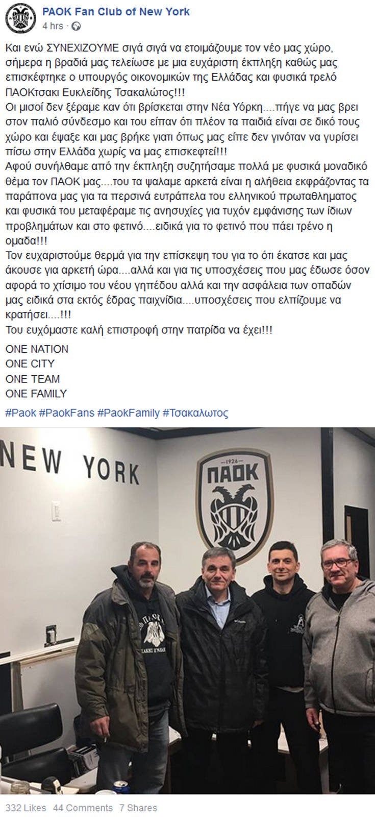 Στη Νέα Υόρκη βρίσκεται ο υπουργός Οικονομικών,Ευκλείδης Τσακαλώτος για το ετήσιο συνέδριο «Invest in Greece» και στο περιθώριο της επίσκεψής του επισκέφθηκε τον σύνδεσμο οπαδών του ΠΑΟΚ που εδρεύει στην αμερικανική μεγαλούπολη.Ο υπουργός Οικονομικών, ο οποίος είναι γνωστός για την αγάπη που τρέφει στον «δικέφαλο του Βορρά», συζήτησε με τα μέλη του συνδέσμου -σύμφωνα με τους ίδιους- θέματα που αφορούν την αγαπημένη τους ομάδα, όπως το σκηνικό στο ελληνικό ποδόσφαιρο, αλλά και την ανακατασκευή του γηπέδου στην Τούμπα.Δείτε την ανάρτηση: