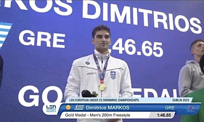 Το χρυσό μετάλλιο κατέκτησε ο Δημήτρης Μάρκος στα 200 μέτρα ελεύθερο στο Ευρωπαϊκό Πρωτάθλημα κολύμβησης Νέων Ανδρών – Νέων Γυναικών (Κ23) στο Δουβλίνο.