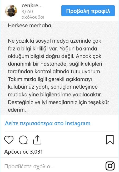 Ο κορονοϊός φαίνεται πως «χτύπησε» τη Φενέρμπαχτσε, καθώς ανακοινώθηκε πως μέλη της ομάδας παρουσίασαν συμπτώματα, αλλά δεν ισχύει η είδηση που δημοσίευσαν κάποια τουρκικά ΜΜΕ και ανέφερε ότι ο Τσενκ Ρεντά είναι στην εντατική. Μάλιστα, την είδηση διέψευσε ο ίδιος ο τιμ μάνατζερ του συλλόγου της Τουρκίας μέσω instagram: «Δυστυχώς, υπάρχουν πολλές ψεύτικες ειδήσεις στα social media. Η είδηση ότι είμαι στην εντατική δεν είναι αληθινή. Βρίσκομαι υπό ιατρική παρακολούθηση σε ένα εξαιρετικό νοσοκομείο. Η ομάδα έβγαλε την απαραίτητη ανακοίνωση, θα ακολουθήσουν νεότερα σύντομα. Σας ευχαριστούμε για την στήριξη και τις ευχές».