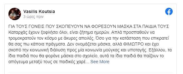 Ο Βασίλης Κουτσιανικούλης λίγο αργότερα κατέβασε την ανάρτησή του και πλέον δεν εμφανίζεται στο προφίλ του.