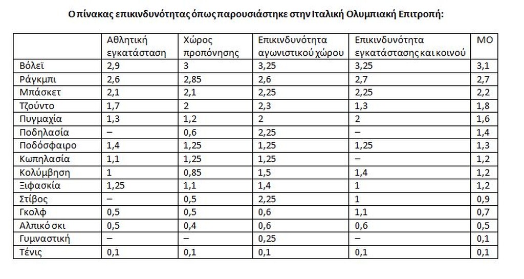 Σύμφωνα με τη μελέτη αυτή, που έχει κλίμακα από 0 ως 4, το τένις και η γυμναστική είναι τα πιο ακίνδυνα αθλήματα αφού έχουν βαθμό επικινδυνότητας μόλις 0,1 ενώ στις υψηλότερες θέσεις είναι το βόλεϊ (3,25), το ράγκμπι (2,70) και το μπάσκετ (2,25). Το ποδόσφαιρο είναι κάπου στη… μέση με βαθμό επικινδυνότητας 1,25…