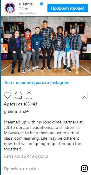 Σε άλλη μια δράση αλληλεγγύης ο Γιάννης θα δωρίσει ακουστικά σε παιδιά του Μιλγουόκι, προκειμένου να κάνει πιο εύκολη την εξ αποστάσεως εκπαίδευση, τώρα που τα σχολεία είναι κλειστά, λόγω κορονοϊού. Κι είναι μια κίνηση με πολλούς συμβολισμούς, ένα μήνυμα ότι ανεξάρτητα από τις συνθήκες δεν πρέπει να σταματά η μάθηση.