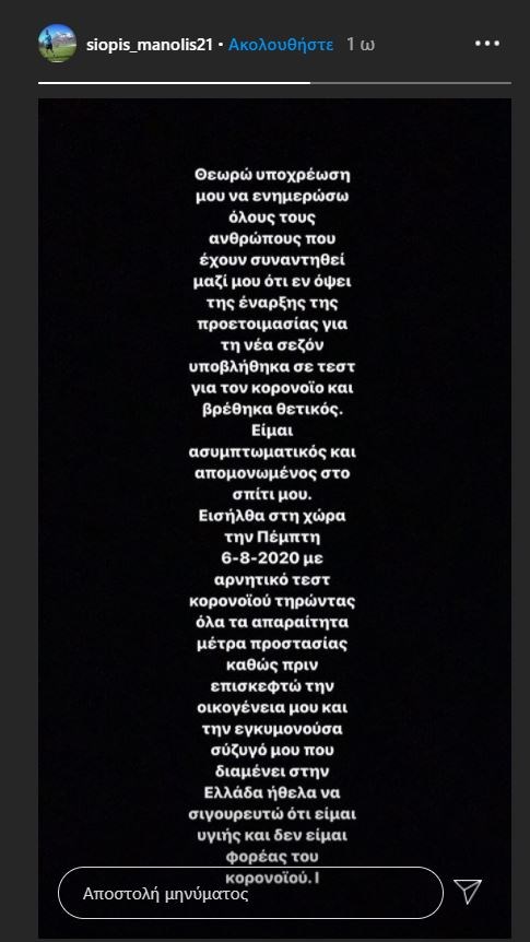 Ο Μανώλης Σιώπης γνωστοποίησε μέσω ανάρτησης που έκανε στον προσωπικό του λογαριασμό στο Instagram ότι βρέθηκε θετικός στον κορονοϊό. Στο μήνυμα που ανέβασε, ο άσος της Αλάνιασπορ τονίζει ότι είναι ασυμπτωματικός και πως έχει απομονωθεί στο σπίτι του.