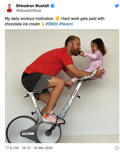 Οι περισσότεροι ποδοσφαιριστές διαθέτουν γυμναστήρια στο σπίτι τους, έτσι ακολουθούν ατομικά προγράμματα εκγύμνασης τώρα που οι προπονήσεις έχουν σταματήσει. Άλλωστε πρέπει να διατηρηθούν σε άψογη φόρμα. Ο ποδοσφαιριστής της Άρσεναλ, Shkodran Mustafi, με την βοήθεια της κόρης του έχει βάλει και παραπάνω κίνητρα στην καθημερινή του γυμναστική, όπως ένα παγωτό σοκολάτα.