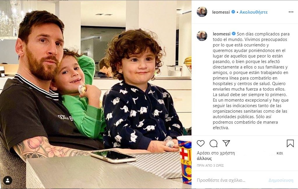 “Είναι περίπλοκες μέρες για όλους. Ζούμε ανήσυχοι για το τι συμβαίνει και θέλουμε να βοηθήσουμε βάζοντας τον εαυτό μας στη θέση εκείνων που ζουν το χειρότερο είτε επειδή τους επηρέασε άμεσα είτε την οικογένεια και τους φίλους τους είτε γιατί εργάζονται στην πρώτη γραμμή για την καταπολέμηση της επιδημίας σε νοσοκομεία και κέντρα υγείας. Θέλω να τους στείλω πολλή δύναμη σε όλους τους. Η υγεία πρέπει πάντα να είναι πάνω απ’ όλα. Είναι μια ιδιαίτερη στιγμή και πρέπει να ακολουθήσουμε τις οδηγίες τόσο των οργανώσεων υγείας όσο και των δημόσιων Αρχών. Μόνο με αυτόν τον τρόπο μπορούμε να το καταπολεμήσουμε αποτελεσματικά. Είναι καιρός να είστε υπεύθυνοι και να παραμείνετε στο σπίτι, είναι επίσης τέλειο για να απολαύσετε χρόνο με τους δικούς σας που δεν μπορούσατε πάντα να έχετε. Μια αγκαλιά και μακάρι να ανατρέψουμε αυτήν την κατάσταση το συντομότερο δυνατό” έγραψε ο Αργεντινός σταρ της μπάλας.