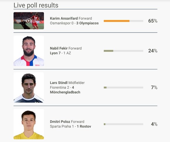 Τον τίτλο του κορυφαίου παίκτη των ρεβάνς των «32» του Γιουρόπα Λιγκ κατέκτησε στη ψηφοφορία του κοινού στην ιστοσελίδα της UEFA ο Καρίμ Ανσαριφάρντ.Ο επιθετικός του Ολυμπιακού, ο οποίος σημείωσε τα δύο από τα τρία «ερυθρόλευκα» γκολ στην Άγκυρα κόντρα στην Οσμάνλισπορ (3-0), συγκέντρωσε την προτίμηση των επισκεπτών του επίσημου σάιτ της ευρωπαϊκής συνομοσπονδίας.Μάλιστα, η επικράτηση του 26χρονου στράικερ ήταν συντριπτική. Συγκέντρωσε το 65% των προτιμήσεων έναντι αντιπάλων του, Ναμπίλ Φεκίρ (Λιόν), Λαρς Στιντλ (Γκλάντμπαχ) και Ντμίτρι Πόλοζ (Ροστόβ).Δείτε τα ποσοστά: