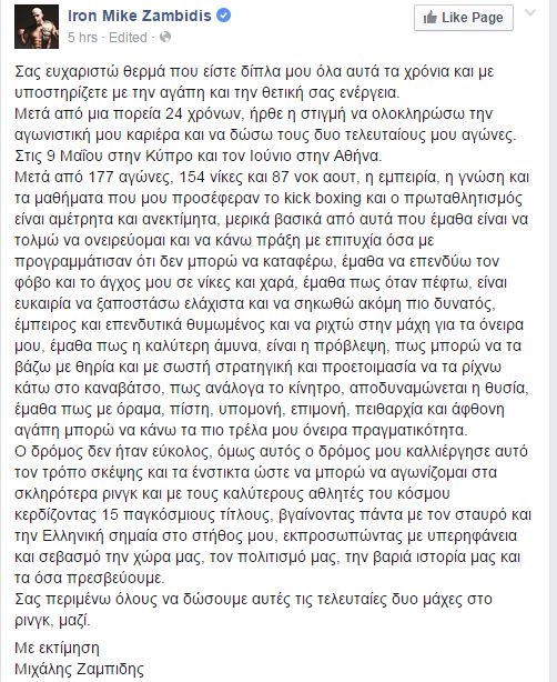 Τέλος τα ρινγκ για τον “Iron Mike“! Ο Μιχάλης Ζαμπίδης ανακοίνωσε μέσα από τον λογαριασμό του στο facebook ότι μετά τον αγώνα της Κύπρου με τον Erkan Varol αυτό το μήνα και έναν αγώνα στην Αθήνα τον Ιούνιο θα βάλει τέλος στην σπουδαία καριέρα του!