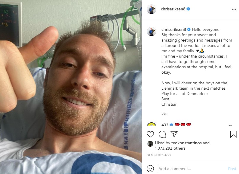 “Γειά σε όλους. Ένα μεγάλο ευχαριστώ για τις γλυκές και καταπληκτικές ευχές και τα μηνύματα που στείλατε από όλον τον κόσμο. Αυτό σημαίνει τα πάντα για εμένα και την οικογένειά μου. Είμαι καλά – δεδομένων των συνθηκών. Πρέπει να κάνω κάποιες εξετάσεις ακόμη στο νοσοκομείο, αλλά αισθάνομαι καλά. Τώρα, θα εμψυχώσω τα αγόρια μου στην ομάδα της Δανίας, για τα επόμενα ματς που έχουν. Προσευχόμαστε όλοι για την Δανία. Κρίστιαν” έγραψε στη λεζάντα ο 29χρονος ποδοσφαιριστής. Ήδη η φωτογραφία έχει συγκεντρώσει πάνω από 1 εκατ. like μέσα σε 50 λεπτά.