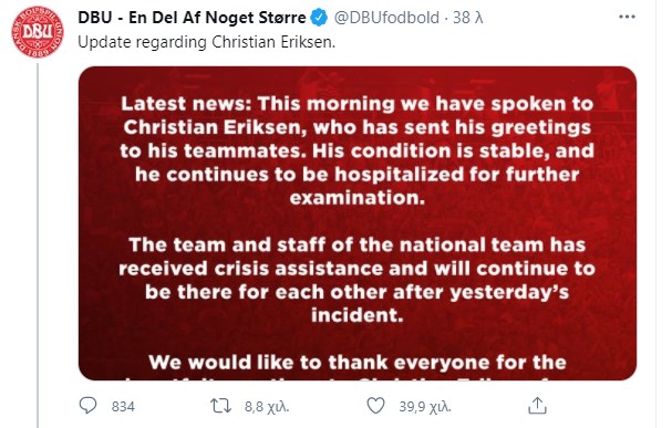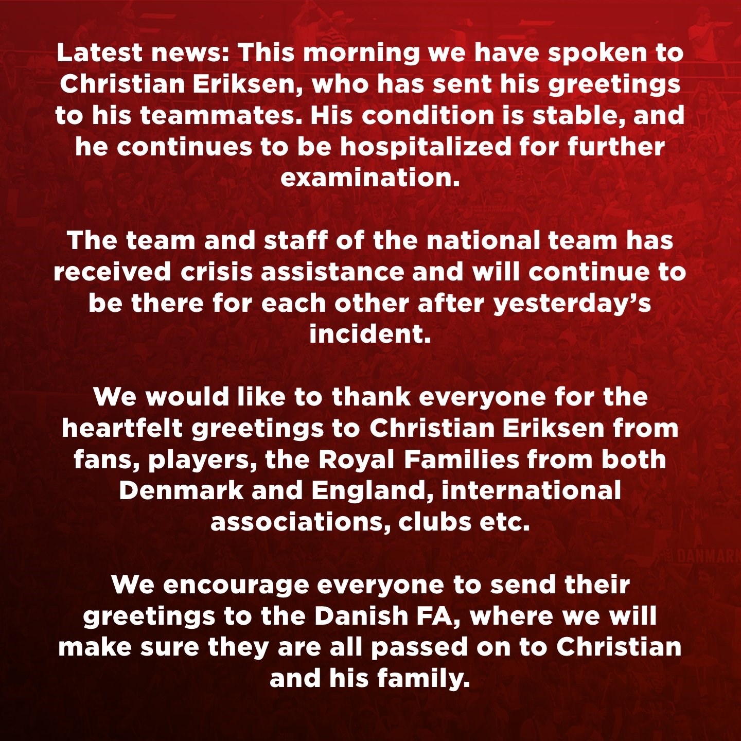 «Τελευταία νέα: Σήμερα το πρωί μιλήσαμε με τον Κρίστιαν Έρικσεν, ο οποίος έστειλε τους χαιρετισμούς του στους συμπαίκτες του. Η κατάστασή του είναι σταθερή και συνεχίζει να νοσηλεύεται για περαιτέρω εξετάσεις. Η ομάδα και οι εργαζόμενοι της εθνικής Δανίας έχουν δεχθεί στήριξη και θα συνεχίσουν να είναι ο ένας δίπλα στον άλλο μετά το χθεσινό περιστατικό. Θέλουμε να ευχαριστήσουμε τους πάντες για τις εγκάρδιες ευχές στον Κρίστιαν Έρικσεν, από τους φιλάθλους, τους παίκτες, τις βασιλικές οικογένειες της Δανίας και της Αγγλίας, τις εθνικές ομοσπονδίες, τους συλλόγους και όχι μόνο. Ενθαρρύνουμε τον καθένα να στείλει τα μηνύματά του στην ποδοσφαιρική ομοσπονδία της Δανίας, που θα φροντίσει να τα μεταφέρει στον Κρίστιαν και στην οικογένειά του».