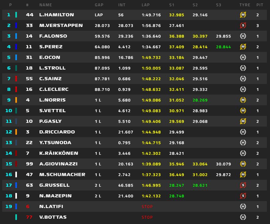 Ο Φερστάπεν, που εκκίνησε από την 7η θέση λόγω ποινής 5 θέσεων, επειδή αγνόησε χθες τις κίτρινες σημαίες, επέστρεψε άμεσα με την εκπληκτική του εκκίνηση στη δεύτερη θέση. Ωστόσο, ποτέ δεν κατάφερε να βρει το ρυθμό του Χάμιλτον, που έδειχνε να κάνει άνετο αγώνα συντήρησης των ελαστικών στην κορυφή.