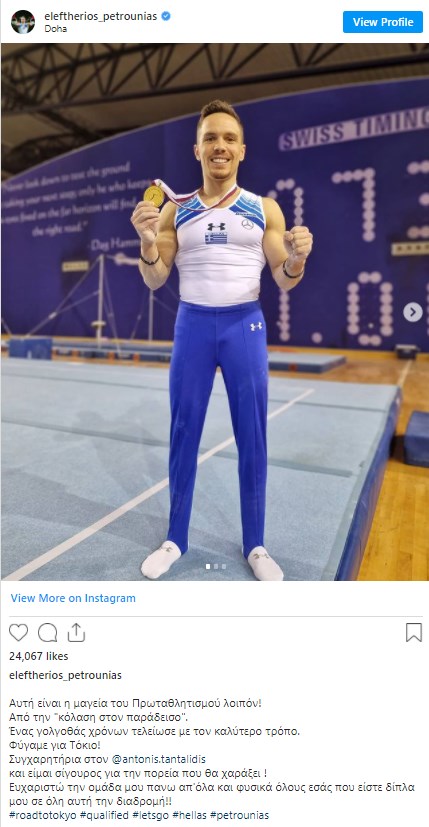 Ο “άρχοντας των κρίκων» κατέκτησε το χρυσό μετάλλιο στο Παγκόσμιο Κύπελλο της Ντόχα και με βαθμολογία 15.500 «σφράγισε» το εισιτήριο για την Ιαπωνία. «Αυτή είναι η μαγεία του Πρωταθλητισμού λοιπόν! Ένας Γολγοθάς χρόνων τελείωσε με τον καλύτερο τρόπο. Φύγαμε για Τόκιο! Συγχαρητήρια στον @antonis.tantalidis και είμαι σίγουρος για την πορεία που θα χαράξει! Ευχαριστώ την ομάδα μου πάνω απ’ όλα και φυσικά όλους εσάς που είστε δίπλα μου σε όλη αυτή την διαδρομή!!», έγραψε στα social media ο χρυσός Ολυμπιονίκης του 2016.