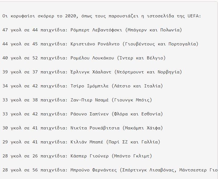 Στην κορυφή του πίνακα των σκόρερ στην Ευρώπη για το 2020, τερμάτισε ο Ρόμπερτ Λεβαντόφσκι, με τον σύλλογο και την εθνική του ομάδα, για δεύτερη χρονιά. Ο Πολωνός διεθνής επιθετικός, μετά τα 54 του γκολ το 2019, σημείωσε το 2020 άλλα 47, καθώς η Μπάγερν, κέρδισε πέντε τίτλους, ανάμεσά τους και το Champions League.
