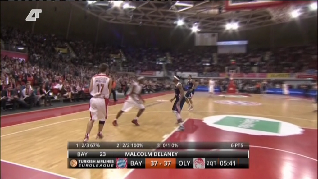 Σ’ ένα παιχνίδι με πολύ υψηλό σκορ, ο Ολυμπιακός προηγείται με 59-50 της Μπάγερν στο ημίχρονο. Οι πρωταθλητές Ευρώπης είναι πολύ εύστοχοι στα τρίποντα (8/14). Πρώτος σκόρερ των “ερυθρόλευκων” ο Βασίλης Σπανούλης με 14 πόντους.