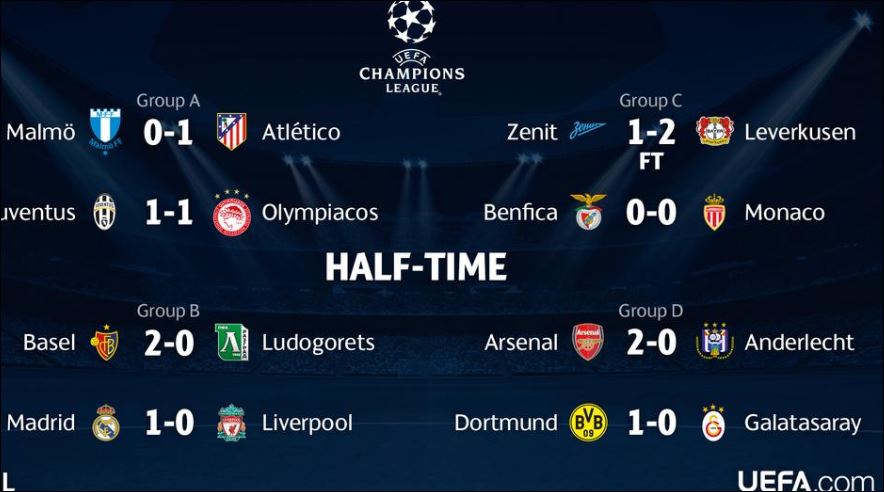Live Champions League: Tα αποτελέσματα του ημιχρόνου