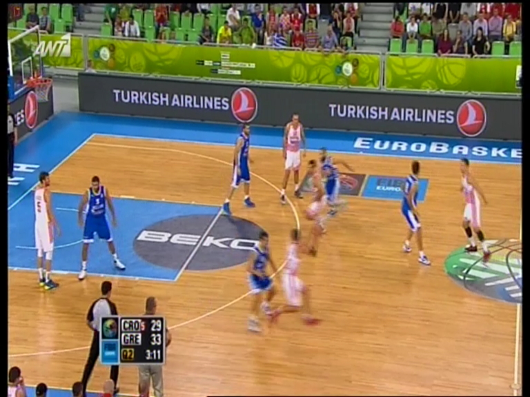 H εθνική μας χάνει με 34-36 από την Κροατία στο πρώτο ημίχρονο. Πρώτος σκόρερ για την Ελλάδα ο Μάικ Μπράμος με επτά πόντους και ακολουθούν οι Σπανούλης και Καββαδάς που έχουν πετύχει από 6.