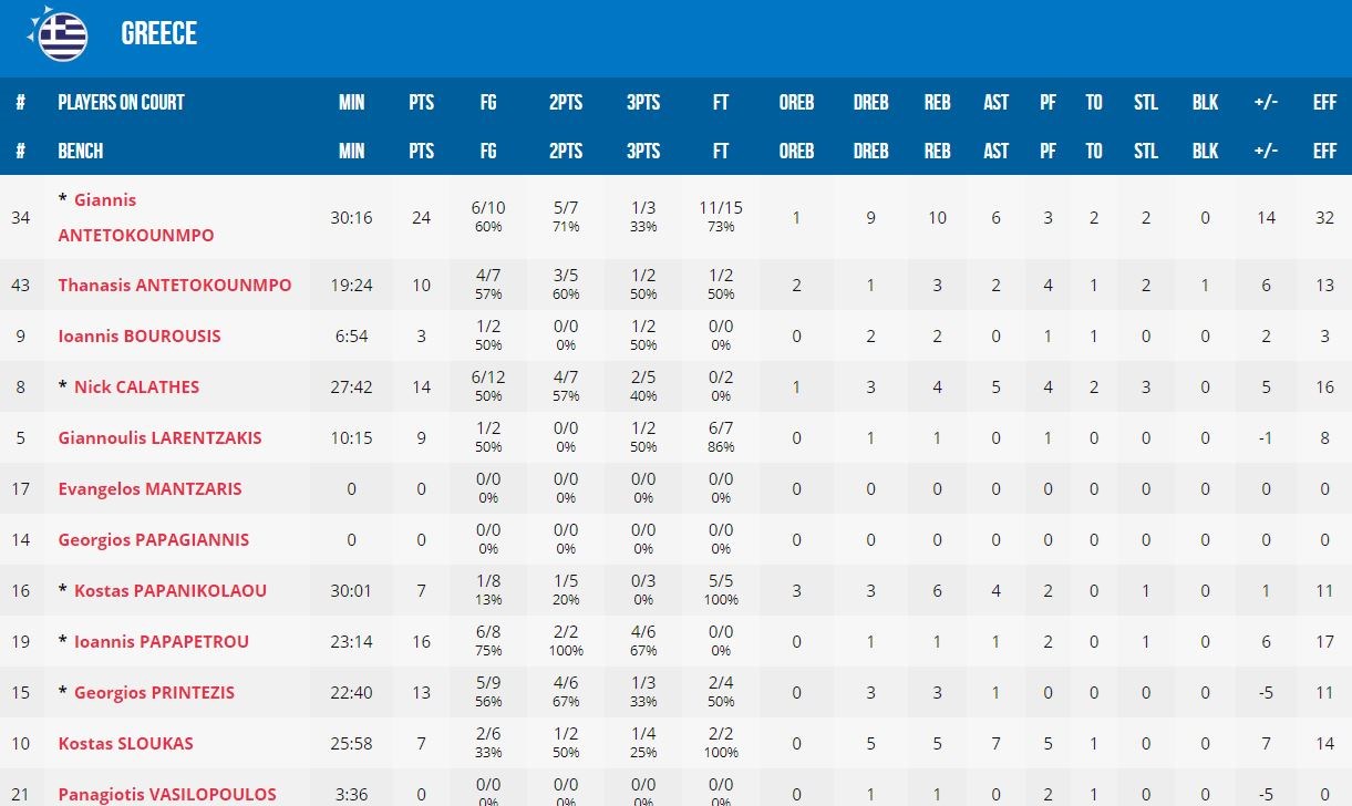 Με μπροστάρη τον Γιάννη Αντετοκούνμπο που σημείωσε 24 πόντους η Ελλάδα ξεπέρασε το εμπόδιο της Νέας Ζηλανδίας επικρατώντας με 103-97 και πήρε την πρόκριση για τους «16» του Παγκοσμίου Κυπέλλου. Αρχίζουν τα… δύσκολα για την Εθνική, η οποία θα διεκδικήσει την είσοδο στην οκτάδα απέναντι στις ΗΠΑ και την Τσεχία, η οποία άφησε εκτός διοργάνωσης την Τουρκία.Η Ελλάδα θα αντιμετωπίσει τις ΗΠΑ το Σάββατο και την Τσεχία τη Δευτέρα με την Βραζιλία να συμπληρώνει το γκρουπ στην επόμενη φάση. Η Ελλάδα ήταν το φαβορί της αναμέτρησης και κατάφερε να πάρει τη νίκη – πρόκριση, αν και είναι γεγονός πως προβλημάτισε, κυρίως με την αμυντική συμπεριφορά της. Δέχθηκε, άλλωστε, 97 πόντους από μία ομάδα που είναι αρκετά… επίπεδα πιο κάτω και δεν κατάφερε σε κανένα σημείο του αγώνα να βάλει «στοπ» στον Κόρι Γουέμπστερ που σημείωσε 31 πόντους και στον αδερφό του Τάι, ο οποίος τελείωσε το ματς με 17. Το σημαντικό, βέβαια, είναι ότι η… δουλειά έγινε, η πρόκριση ήρθε και η Εθνική πέτυχε τον πρώτο στόχο της. Για την Ελλάδα ο Γιάννης Αντετοκούνμπο σημείωσε 24 πόντους και «γέμισε» την στατιστική του με 10 ριμπάουντ και 6 ασίστ. Εξαιρετικό παιχνίδι έκανε (και) ο Παπαπέτρου, ο οποίος σημείωσε 16 πόντους με τέσσερα τρίποντα, εκ των οποίων τα δύο συνεχόμενα «κόβοντας» τον αέρα της Νέας Ζηλανδίας, όταν άρχισε να πλησιάζει επικίνδυνα. Ο Νικ Καλάθης πρόσθεσε 14 πόντους, ο Πρίντεζης 13 και ο Θανάσης Αντετοκούνμπο 10.