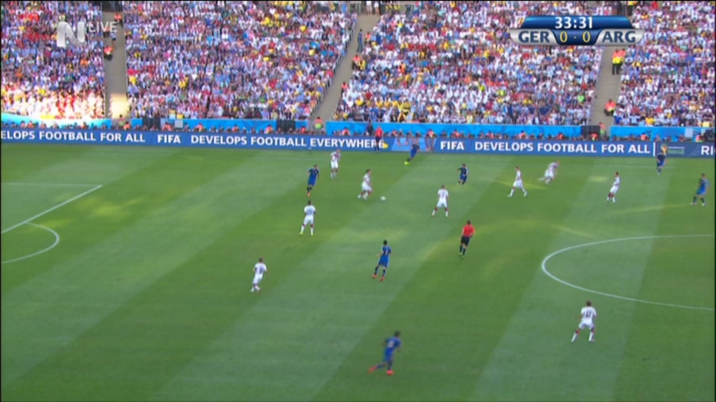 Μεγάλη μάχη γίνεται στο Μαρακανά με την Αργεντινή να κοντράρει στα ίσα τη Γερμανία, η οποία είναι θεωρητικά το φαβορί του τελικού του Μουντιάλ. Οι δύο ομάδες είχαν από μια σπουδαία ευκαιρία για να ανοίξουν το σκορ. Η Αργεντινή στο 21 με τον Ιγκουαϊν να πλασάρει άστοχα απέναντι από τον Νόιερ μετά από λάθος του Κροος και η Γερμανία στην εκπνοή του ημιχρόνου με τον Χέβεντες να στέλνει τη μπάλα στο αριστερό κάθετο δοκάρι του Ρομέρο μετά από κόρνερ.