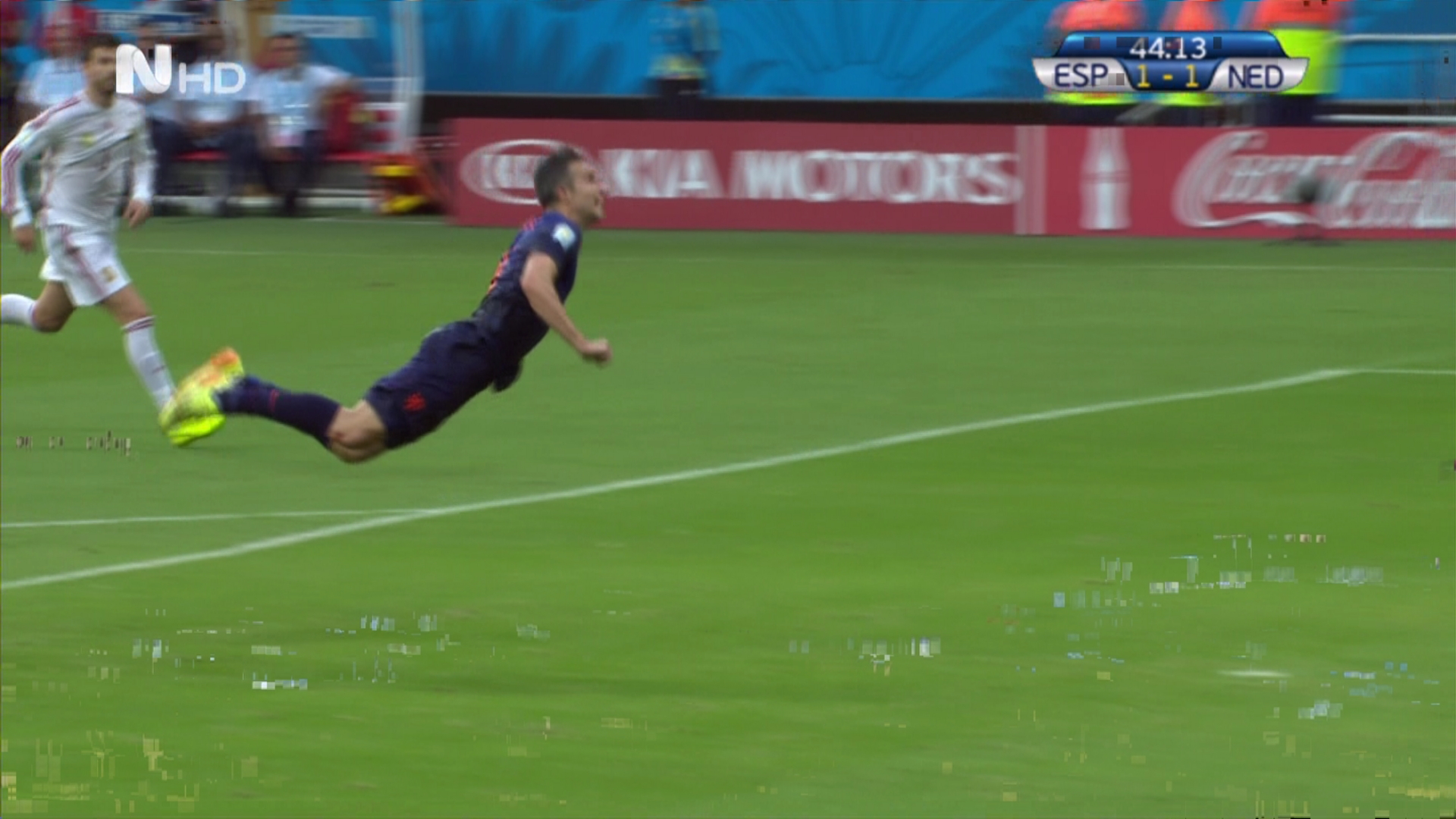 Ισόπαλο 1-1 έληξε το ημίχρονο ανάμεσα στην Ισπανία και την Ολλανδία. Οι “φούριας ρόχας” προηγήθηκαν στο 27 με πέναλτι του Τσάμπι Αλόνσο, το οποίο κέρδισε ο Ντιέγκο Κόστα σε μαρκάρισμα του Ντε Φράι. Το ριπλέι έδειξε ότι δεν υπήρξε παράβαση. Οι “οράνιε” ισοφάρισαν στο 44 με ένα εκπληκτικό γκολ του Φαν Πέρσι. Ο Μπλιντ σέντραρε από τα αριστερά και ο επιθετικός της Μάντσεστερ Γιουνάιτεντ με μια εντυπωσιακή κεφαλιά έστειλε τη μπάλα στα δίχτυα του Κασίγιας.
