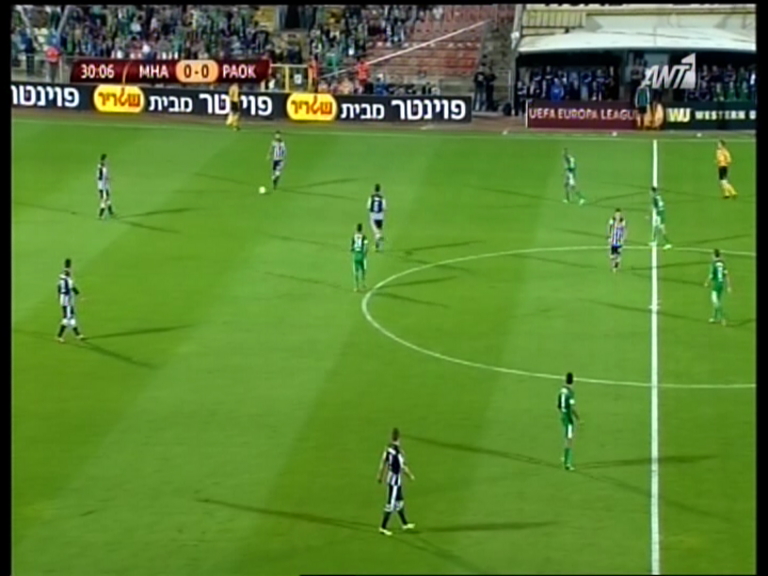 Ισόπαλο χωρίς τέρματα έληξε το πρώτο ημίχρονο της αναμέτρησης ανάμεσα στη Μακάμπι Χάιφα και τον ΠΑΟΚ για την 4η αγωνιστική των ομίλων του Γιουρόπα Λιγκ. Η ελληνική ομάδα έφτασε πολύ κοντά στο γκολ στην εκπνοή του πρώτου μέρος, όμως, ο τερματοφύλακας των γηπεδούχων εξουδετέρωσε με τα πόδια του σουτ του Στοχ μέσα από τη μεγάλη περιοχή.