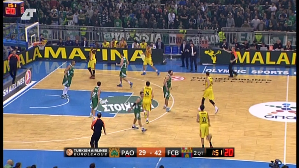 Ο Παναθηναϊκός πέτυχε μόνο εννέα πόντους στο δεύτερο δεκάλεπτο, με συνέπεια η Μπαρτσελόνα να πάει με διαφορά 12 πόντων (32-44) στο ημίχρονο. Πρώτος σκόρερ των πρωταθλητών Ελλάδας ο Λάσμε με 7 πόντους.