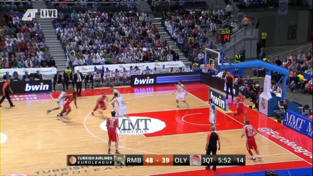 Ο Ολυμπιακός παλεύει στη Μαδρίτη, όπου χάνει με 59-52 από την Ρεάλ στο τρίτο δεκάλεπτο. Πρώτος σκόρερ της ελληνικής ομάδας ο Σπανούλης με 11 πόντους.