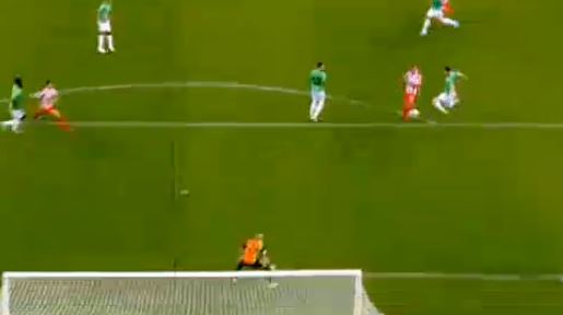 Με ένα τυχερό γκολ ο Ολυμπιακός άνοιξε το σκορ στο 4. Ο Φουστέρ έπιασε το σουτ έξω από την περιοχή, η μπάλα κόντραρε στον Μελίσση, άλλαξε πορεία και κατέληξε στα δίχτυα.