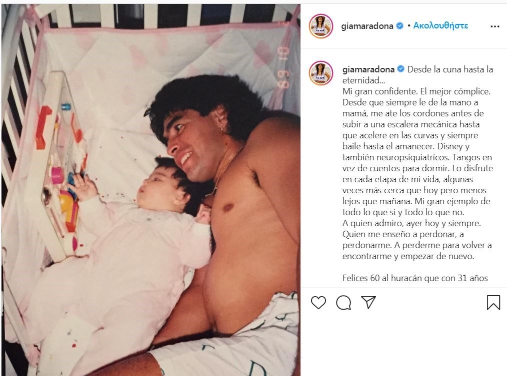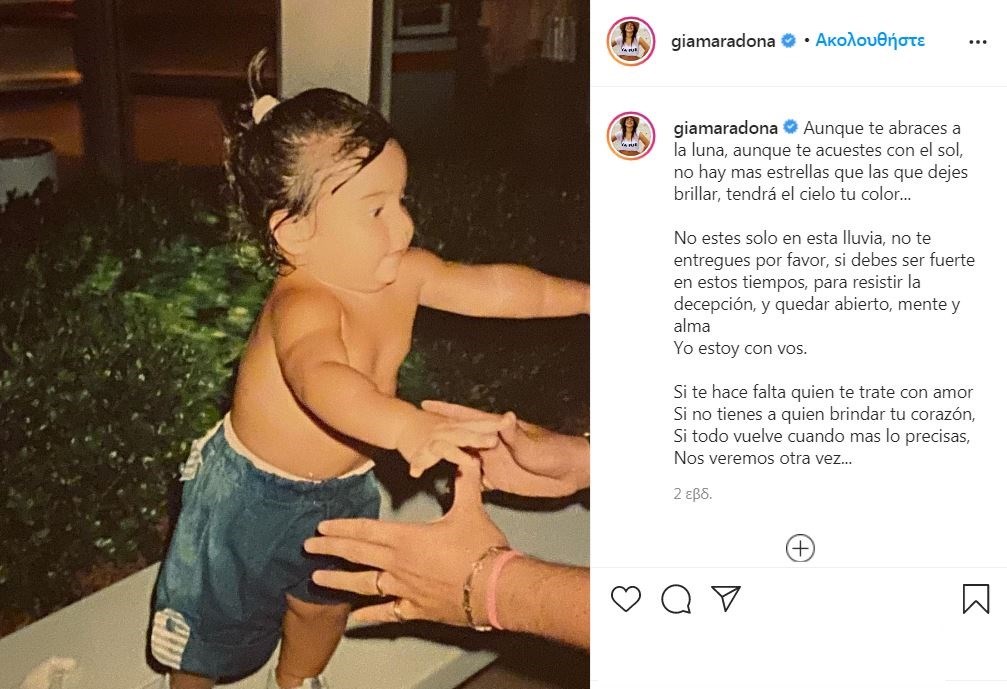Θρήνος και για τις τρεις κόρες του θρύλου του παγκόσμιου ποδοσφαίρου, με την Τζιανίνα Μαραντόνα να κάνει πριν λίγη ώρα και μία ανάρτηση με τη φωτογραφία του πατέρα της σε τοιχογραφία στους δρόμους της Αργεντινής.