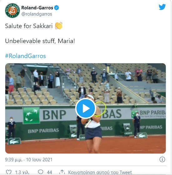 Είναι χαρακτηριστικές οι αναρτήσεις του Roland Garros στο twitter μετά το τέλος του αγώνα, όπου γίνεται λόγος για την “πολεμίστρια” Σάκκαρη, ενώ την αποχαιρετούν με την ατάκα “απίστευτα πράγματα, Μαρία”.