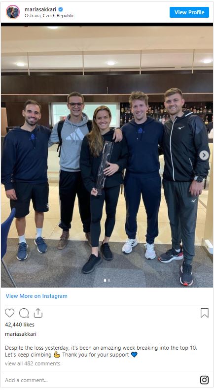 Θέλοντας να ευχαριστήσει τους δικούς της ανθρώπους για τη στήριξη μετά την ήττα από την Ανέτ Κονταβέιτ στον τελικό του Ostrava Open με 2-0 σετ, δημοσίευσε μία ομαδική φωτογραφία, στην οποία είναι και ο σύντροφός της, Κωνσταντίνος Μητσοτάκης. Μαζί τους ήταν και ο συναθλητής της, Γιάννης Στεργίου, ο προπονητής της Τομ Χιλ και ο Τζέισον Μάθιου.