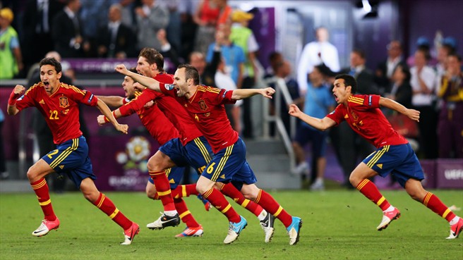 Η Ισπανία έχει την ευκαιρία να γράψει με χρυσά γράμματα στη βίβλο του ποδοσφαίρου το όνομά της, αφού μετά την κατάκτηση του Euro το 2008 και του Παγκοσμίου Κυπέλλου το 2010 διεκδικεί ένα ακόμη τρόπαιο.Η αρμάδα του Ντελ Μπόσκε είναι η πρώτη ομάδα από το 1970 που καταφέρνει να φθάσει στον τελικό τριών κατά σειρά διοργανώσεων, ενώ φιλοδοξεί να γίνει και η πρώτη που θα κατακτήσει για δεύτερη συνεχόμενη φορά τον τίτλο του πρωταθλητή Ευρώπης.Αντίπαλος των Ισπανών στον τελικό του Κιέβου (Κυριακή 21:45) θα είναι η πολυνίκης του θεσμού Γερμανία ή η Ιταλία. Η αναμέτρηση των δύο ομάδων θα διεξαχθεί αύριο Πέμπτη (21:45) στη Βαρσοβία.Πηγή φωτογραφιών: uefa.com