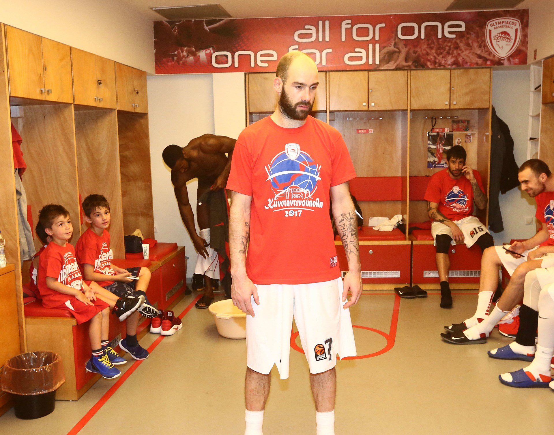 Μάλιστα οι Πειραιώτες πανηγύρισαν με τα μπλουζάκια που είχαν ετοιμάσει για τη 10η συμμετοχή τους στην τελική φάση του τουρνουά, ενώ ο Βασίλης Σπανούλης είχε τα παιδιά του στα αποδυτήρια την ώρα που περιμένει το νέο μέλος της οικογένειάς του.