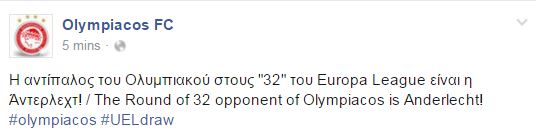 Τη Βελγική Άντερλεχτ θα βρει στο δρόμο του ο Ολυμπιακός στη φάση των 32 του Europa League. Το πρώτο παιχνίδι θα διεξαχθεί στις 18 Φεβρουαρίου στο Βέλγιο και στις 25 του ίδιου μήνα θα γίνει η ρεβάνς στο «Γεώργιος Καραϊσκάκης».