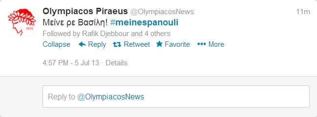 Με σύνθημα το #MEINESPANOULI, οι οπαδοί του Ολυμπιακού περιμένουν το σημερινό ραντεβού του V-Span με τους ιδιοκτήτες της ομάδας όπου και θα παρθεί τελική απόφαση.