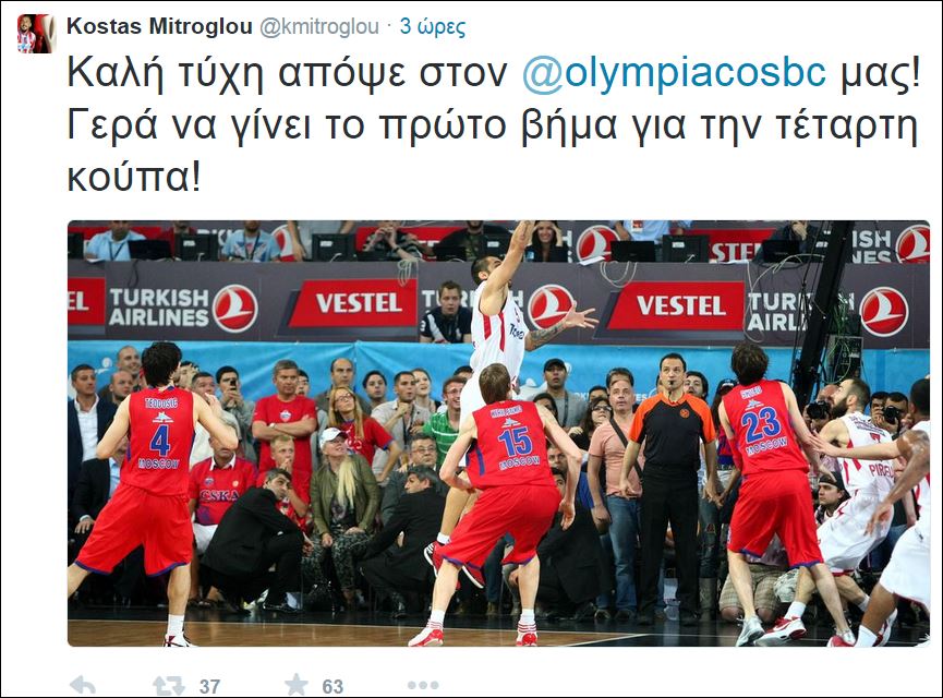 Ο Κώστας Μήτρογλου ευχήθηκε καλή τύχη στην ομάδα μπάσκετ του Ολυμπιακού, η οποία σε λίγες ώρες αντιμετωπίζει την ΤΣΣΚΑ Μόσχας στο Φάιναλ Φορ της Ευρωλίγκας που διεξάγεται στη Μαδρίτη.