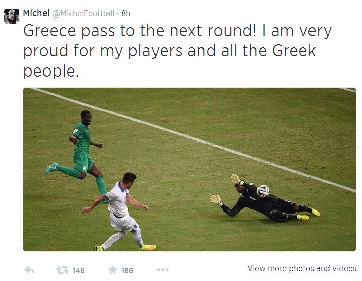 «Η Ελλάδα στα νοκ άουτ. Χαίρομαι από καρδιάς για τους παίκτες μου και όλο τον ελληνικό λαό», έγραψε ο προπονητής του Ολυμπιακού στο Twitter.