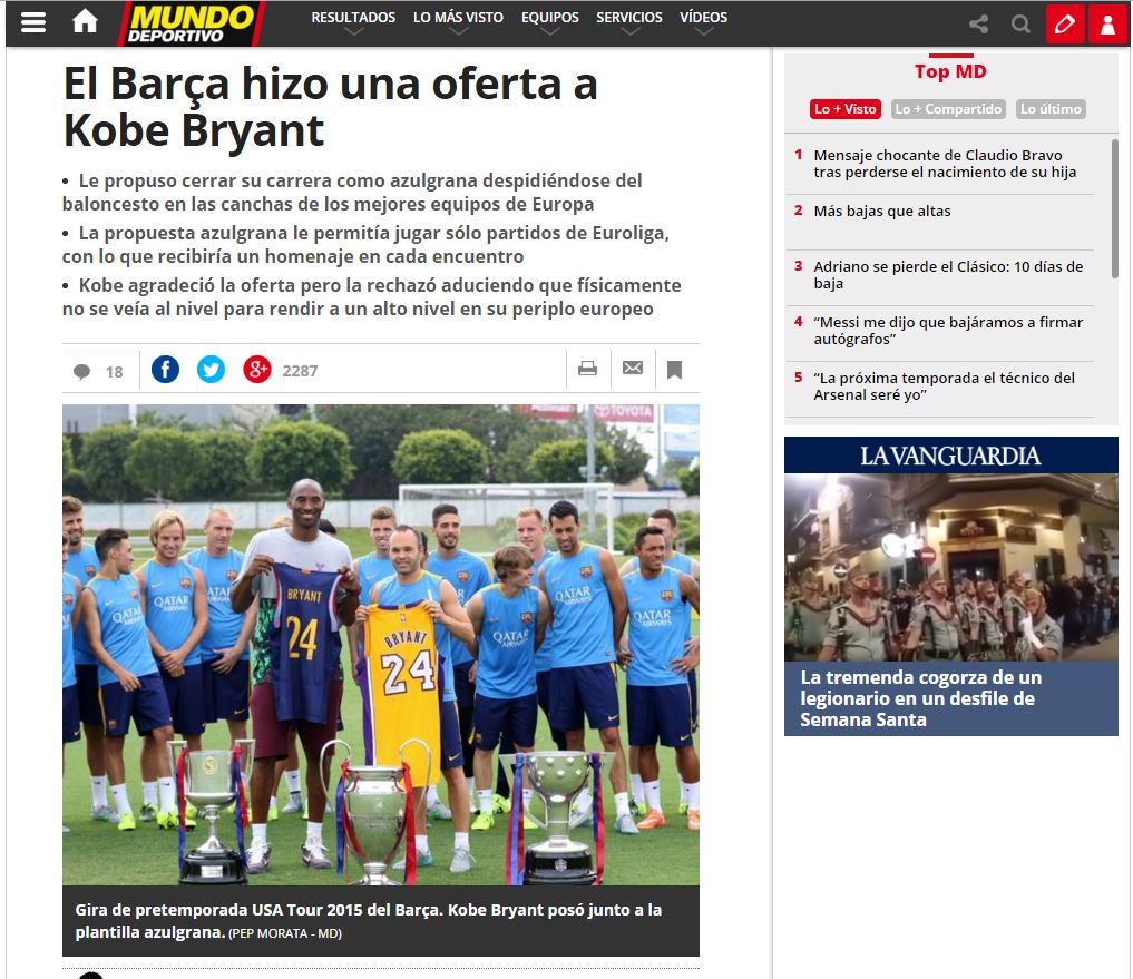 Σύμφωνα με την “Mundo Deportivo” η Μπαρτσελόνα θέλει να πραγματοποιήσει την μεγαλύτερη μεταγραφή στην ιστορία της καθώς κατέθεσε επίσημη πρόταση στον Κόμπι Μπράιαντ, ο οποίος έχει ανακοινώσει πως η τρέχουσα σεζόν είναι η τελευταία της μεγάλης καριέρας του.