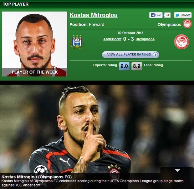 Με την εντυπωσιακή εμφάνισή του και φυσικά το χατ τρικ που σημείωσε κόντρα στην Άντερλεχτ, ο Κώστας Μήτρογλου κέρδισε τον τίτλο του πολυτιμότερου ποδοσφαιριστή της 2ης αγωνιστικής των ομίλων του champions league.
