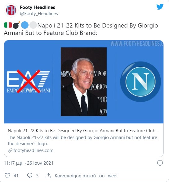 Έπειτα από αρκετά χρόνια, η συμφωνία με την «Kappa», η οποία έντυνε την ομάδα, αναμένεται να τελειώσει, καθώς σύμφωνα με τα όσα αναφέρει η «Corriere dello Sport», τον σχεδιασμό της νέας φανέλας θα αναλάβει ο κορυφαίος Ιταλός σχεδιαστής μόδας, Τζόρτζιο Αρμάνι. Μάλιστα, η επίσημη παρουσίαση της νέας φανέλας της Νάπολι θα γίνει μέχρι τα τέλη Ιουλίου.
