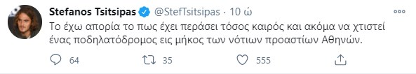 Λίγες ημέρες αφού προκάλεσε αντιδράσεις με την ανάρτηση περί του εμπορικού κέντρου Harrods, που θα έπρεπε να υπάρχει στην Ελλάδα, ο Στέφανος Τσιτσιπάς «ξαναχτύπησε». Συγκεκριμένα την Παρασκευή (11/12), ο Έλληνας τενίστας έγραψε στο twitter: «Το έχω απορία το πως έχει περάσει τόσος καιρός και ακόμα να χτιστεί ένας ποδηλατόδρομος εις μήκος των νότιων προαστίων Αθηνών».