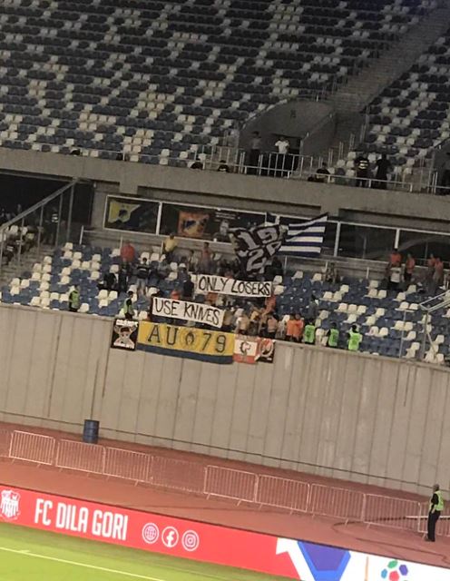 Το πρώτο πανό των γεωργιανών χούλιγκαν γράφει: «Δόξα στους ήρωες. 07/08» και αναφέρεται στα τραγικά γεγονότα το βράδυ της Δευτέρας στην Νέα Φιλαδέλφεια. Το επόμενο πανό γράφει: «Λευτεριά στους BBB (σ.σ. Bad Blue Boys).