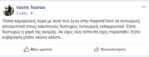 “Τόσκα καμαρώνεις τώρα με αυτό που έγινε στην Κηφισιά; Αντί να λειτουργείς αποτρεπτικά στους κακοποιούς δυστυχώς λειτουργείς ενθαρρυντικά. Είστε δυστυχώς η χαρά της ανομίας. Αν είχες λίγη τσίπα θα είχες παραιτηθεί. Είστε κυβέρνηση μπάτε σκύλοι αλέστε…”, έγραψε στον προσωπικό του λογαριασμό στο Facebook ο παλαίμαχος ποδοσφαιριστής.