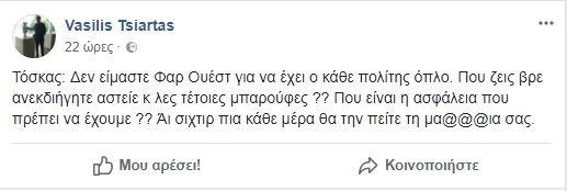 “Τόσκας: Δεν είμαστε Φαρ Ουέστ για να έχει ο κάθε πολίτης όπλο. Που ζεις βρε ανεκδιήγητε αστείε κ λες τέτοιες μπαρούφες ?? Που είναι η ασφάλεια που πρέπει να έχουμε;; Άι σιχτίρ πια κάθε μέρα θα την πείτε τη μα@@@ια σας”, είχε γράψει τότε στο Facebook.