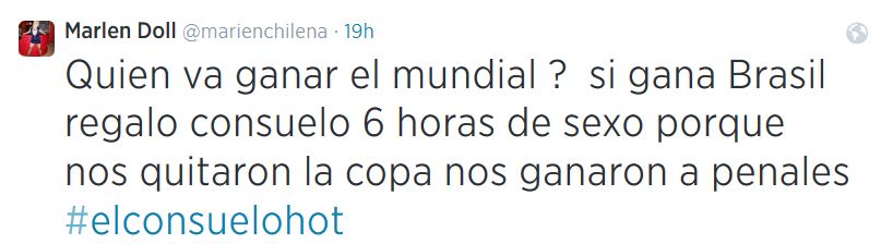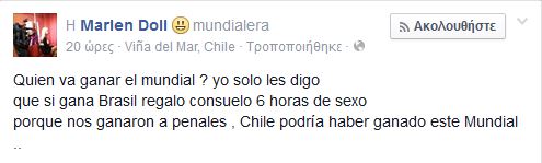 Τι δηλώνει τώρα η Μάρλεν Ντόλ μέσω Facebook και Twitter; Ότι θα προσφέρει 6ωρο σεξ εάν η νικήτρια του τελικού είναι η Βραζιλία. Κι αυτό γιατί όπως λέει η σελεσάο “κέρδισε στα πέναλντι την Χιλή, η οποία θα μπορούσε να είχε κερδίσει το κύπελλο σε αυτό το Μουντιάλ”.