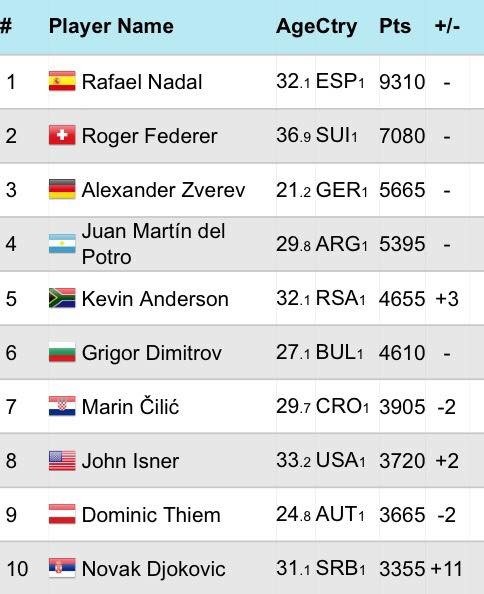 Όσον αφορά στον Νόβακ Τζόκοβιτς, από το Νο 21 επέστρεψε στο Top 10 (Νο 10), μετά την κατάκτηση του αγγλικού Grand Slam, ενώ ο Ράφα Ναδάλ είναι στην κορυφή.