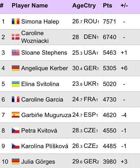 Σε αντίθεση με τον Τσιτσιπά, η Μαρία Σάκκαρη υποχώρησε από το Νο 37 στο Νο 46. Η Σιμόνα Χάλεπ παραμένει στην κορυφή, ενώ η Σερένα Γουίλιαμς που είχε πέσει στο 181, μετά τη γέννηση του παιδιού της και την αποχή της από τα κορτ, επέστρεψε δυναμικά και εκτοξεύτηκε στο Νο 28.