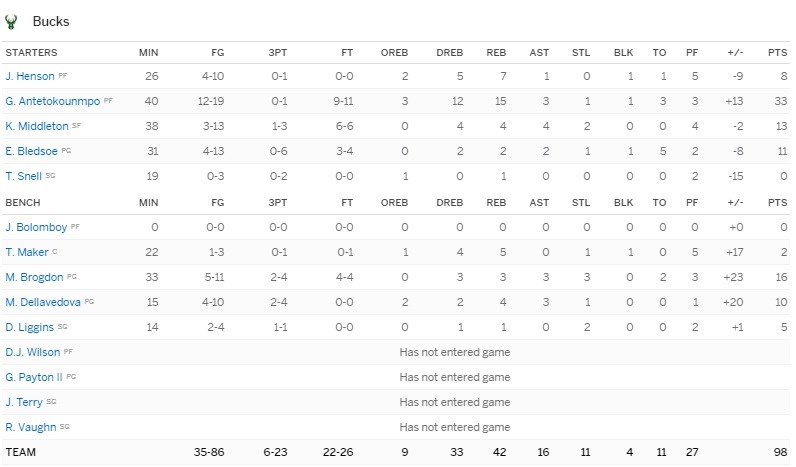 Ο «Κούνμπο» έδωσε άλλη μία παράσταση. Έκανε τα πάντα μέσα στο γήπεδο. Ο «Greek Freak» σε 40 λεπτά είχε 33 πόντους, 15 ριμπάουντ, 3 ασίστ, 1 κλέψιμο και 1 μπλοκ.