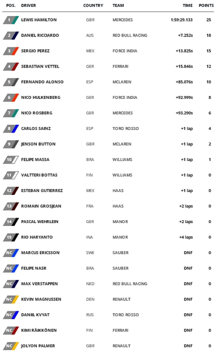 Την πρώτη νίκη του στο φετινό πρωτάθλημα της Formula 1 πανηγυρίζει ο Λιούις Χάμιλτον! Μετά από έναν επεισοδιακό αγώνα στο Μόντε Κάρλο ο Βρετανός πιλότος της Mercedes είδε πρώτος την καρό σημαία για να κατακτήσει την 44η νίκη στην καριέρα του και μόλις την 2η στο Μονακό. Για να συμβεί όμως αυτό έπρεπε να προηγηθεί το πρόβλημα που αντιμετώπισε ο Νίκο Ρόσμπεργκ με την ισχύ του κινητήρα του αλλά και το καταστροφικό pit stop της Red Bull στον pole man Ντάνιελ Ρικιάρντο. Ο Αυστραλός ανέβηκε στο δεύτερο σκαλί του βάθρου ενώ 3ος ήταν ο Σέρχιο Πέρες με Force India. Ο Σεμπάστιαν Φέτελ με Ferrari κατέλαβε την 4η θέση και πίσω του τερμάτισε ο Φερνάντο Αλόνσο με McLaren.