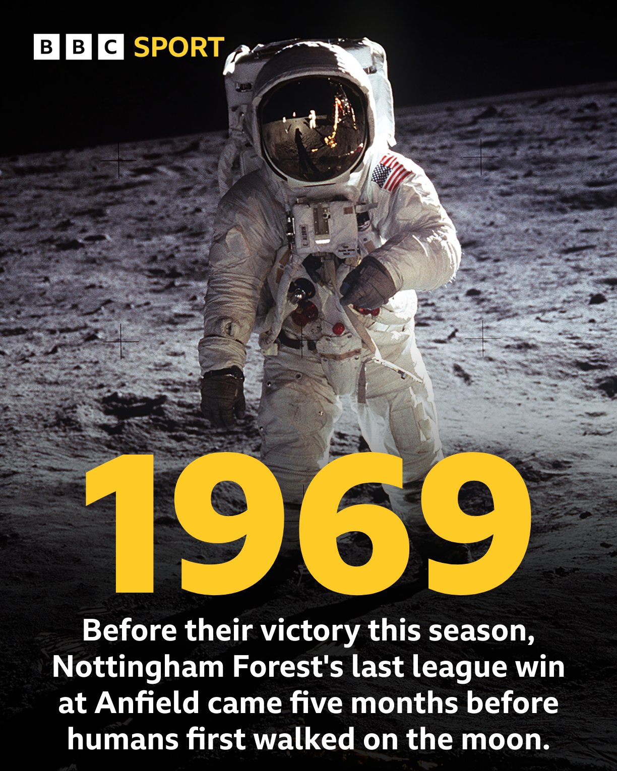 «1969. Πριν από την νίκη της αυτήν την σεζόν, η τελευταία νίκη της Νότιγχαμ στο Άνφιλντ ήταν πέντε μήνες πριν πατήσουν για πρώτη φορά οι άνθρωποι στην Σελήνη» αναφέρει η ανάρτηση, καθώς η τελευταία φορά που νίκησε η Νότιγχαμ στην έδρα της Λίβερπουλ ήταν τον Φεβρουάριο του 1969.