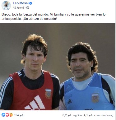 Με μεγάλη αγωνία παρακολουθεί την εξέλιξη της υγείας του και ο Λιονέλ Μέσι, ο οποίος μέσω του προσωπικού του λογαριασμού στο Instagram θέλησε να στείλει το δικό του ξεχωριστό μήνυμα στον συμπατριώτη του.
