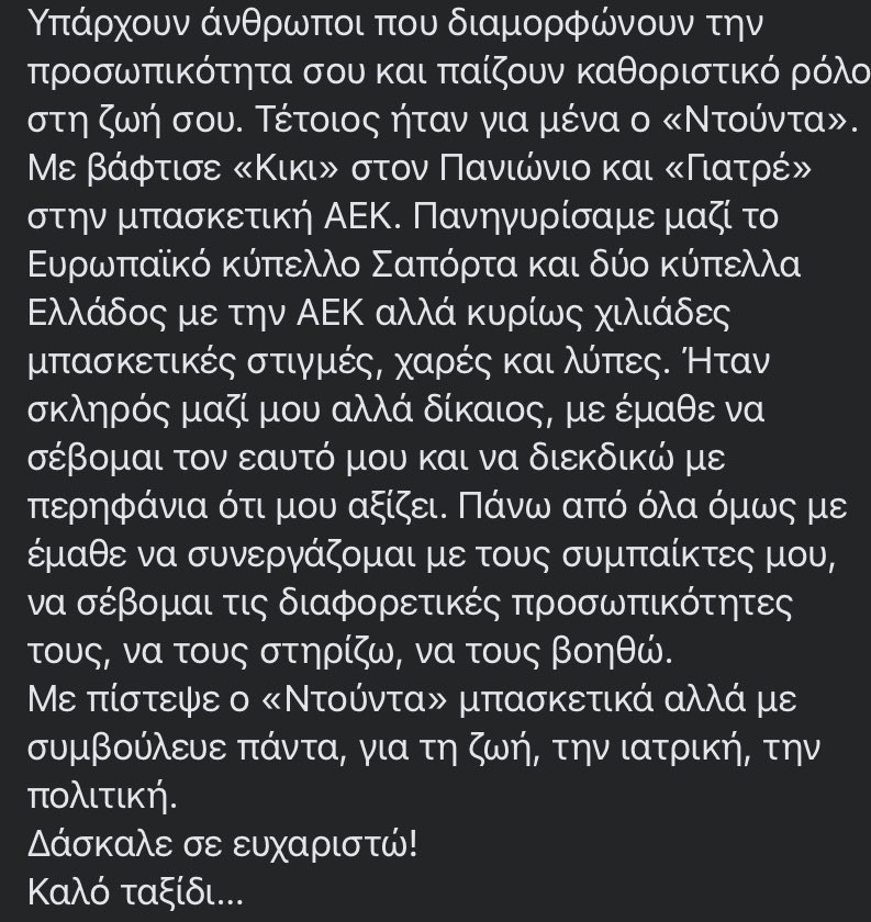 Με πίστεψε ο «Ντούντα» μπασκετικά αλλά με συμβούλευε πάντα, για τη ζωή, την ιατρική, την πολιτική. Δάσκαλε σε ευχαριστώ! Καλό ταξίδι…» έγραψε ο Βασίλης Κικίλιας για τον Ντούσαν Ίβκοβιτς.